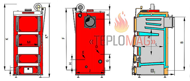 1- Внутрішня стінка корпусу; 2- Зовнішня стінка водяної сорочки; 3- Теплоносій; 4- Камера згоряння; 5- Колосники; 6- Зольник; 7- Конвекційні канали; 8- Теплообмінник; 9- Борів; 10- Шибер димоходу; 11- Ревізійне вікно; 12- Дверцята чищення теплообмінника; 13- Засипні дверцята; 14- Ревізійні дверцята; 15- Вигрібні дверцята поличника; 16- Муфта під'єднання регулятора; 17- Муфта під'єднання групи безпеки; 18- Механічний регулятор тяги; 19- Механічний термометр; 20- Електронний блок керування; 21- Вентилятор наддуву повітря; 22- Захисний кожух кабелів; 23- Капіляр для датчиків температури; 24- Теплоізоляція котла; 25- Регульована завіса — двійка; 26- Регульований замок дверцят; 27- Ручки дверцят; 28- Накладка-екран дверцята; 29- Вогнетривкий ущільнювач дверей; 30-Захисна решітка; 31- Муфта під'єднання магістралі подавання; 32- Муфта під'єднання зворотної магістралі; 33- Муфта зливання води з котла; 34- Механічний клапан піддування; 35- Тяга для механічного регулятора; 36- Гвинт регулювання відкриття піддування; 37- Заглушка; 38- Ручка ударника; 39- Датчик димових газів; 40- Основний канал подавання повітря; 41- Канал розподілу повітря; 42- Повітряні форсунки; 43- Лоток поличника; 44- Регульовані ніжки; 45- Обшивка котла.